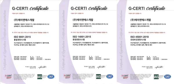 ISO 9001(품질경영시스템), ISO 14001(환경경영시스템), ISO 45001(안전보건경영시스템) 3가지를 인증 받았습니다!!